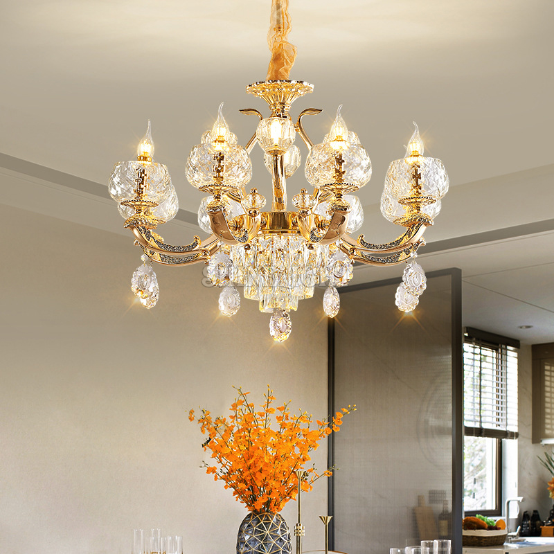 - Những viên pha lê được cắt gọt tỉ mỉ, khi ánh sáng chiếu qua sẽ phản xạ lung linh, tạo hiệu ứng thị giác sống động. Mỗi viên pha lê không chỉ đóng vai trò trang trí mà còn góp phần tăng cường độ sáng, phân bổ ánh sáng đều khắp không gian.