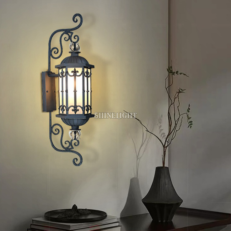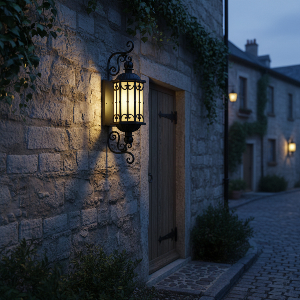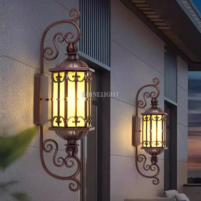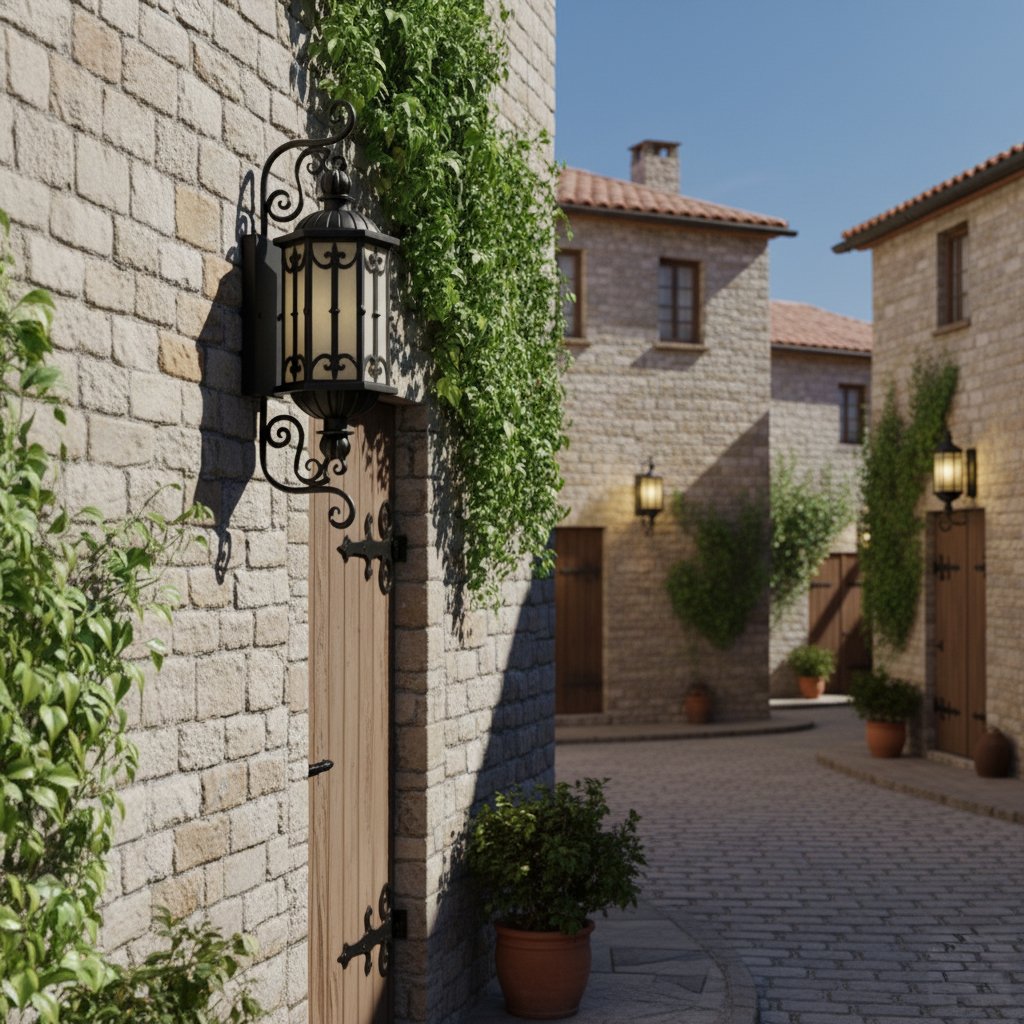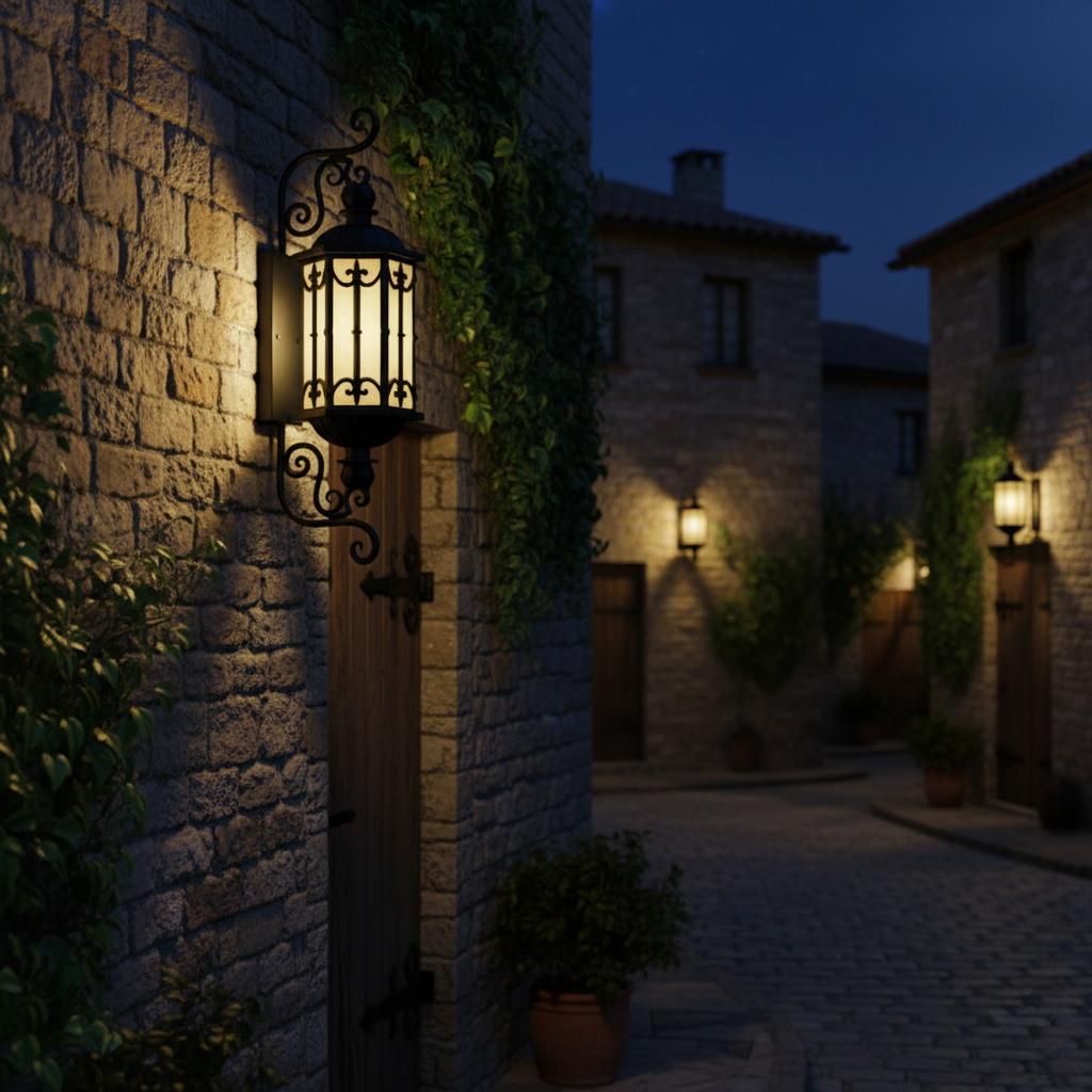 Lắp một đôi đèn hai bên cổng chính sẽ tạo hiệu ứng cổng lâu đài – sang trọng và quyền lực. Treo dọc hành lang ngoài trời, hiên nhà hay tường sân vườn, đèn giúp dẫn lối ánh nhìn, làm nổi bật các chi tiết kiến trúc vốn dễ bị “chìm” trong bóng tối ban đêm.