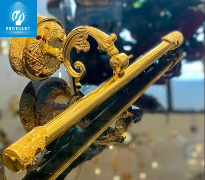 Bóng đèn LED tuổi thọ cao và tiết kiệm điện. Thiết kế cao cấp, hoàn thiện bằng chất liệu đồng với kiểu dáng nhiều hoa văn đem lại sự sang trọng, tinh tế.